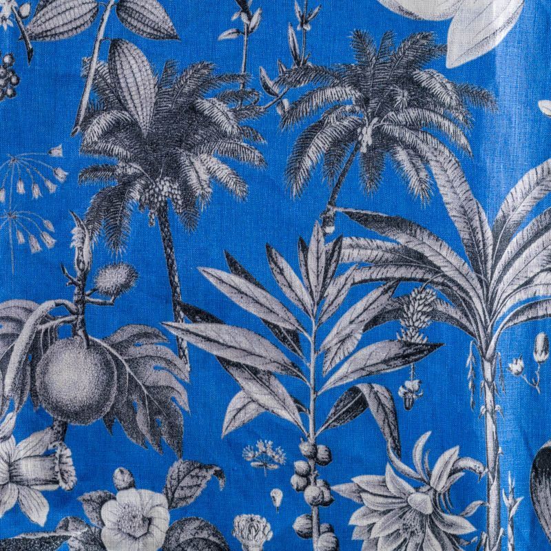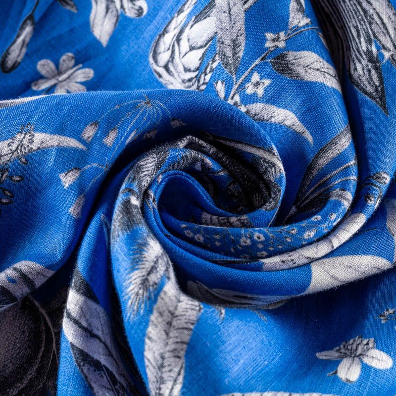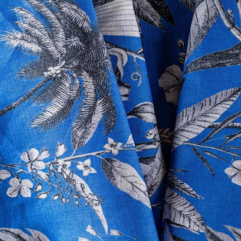 Прочный, выразительная матовая рельефная поверхность, полотняное переплетение, хорошо держит форму, мягкий на ощупь, пластичный, отлично драпируется. Прекрасно подойдет для пошива летних платьев, сарафанов, юбок, рубашек, брюк и шорт. Льняная плательная ткань с изображением  тропических растений и цветов  в монохромной палитре на выразительном синем фоне.
