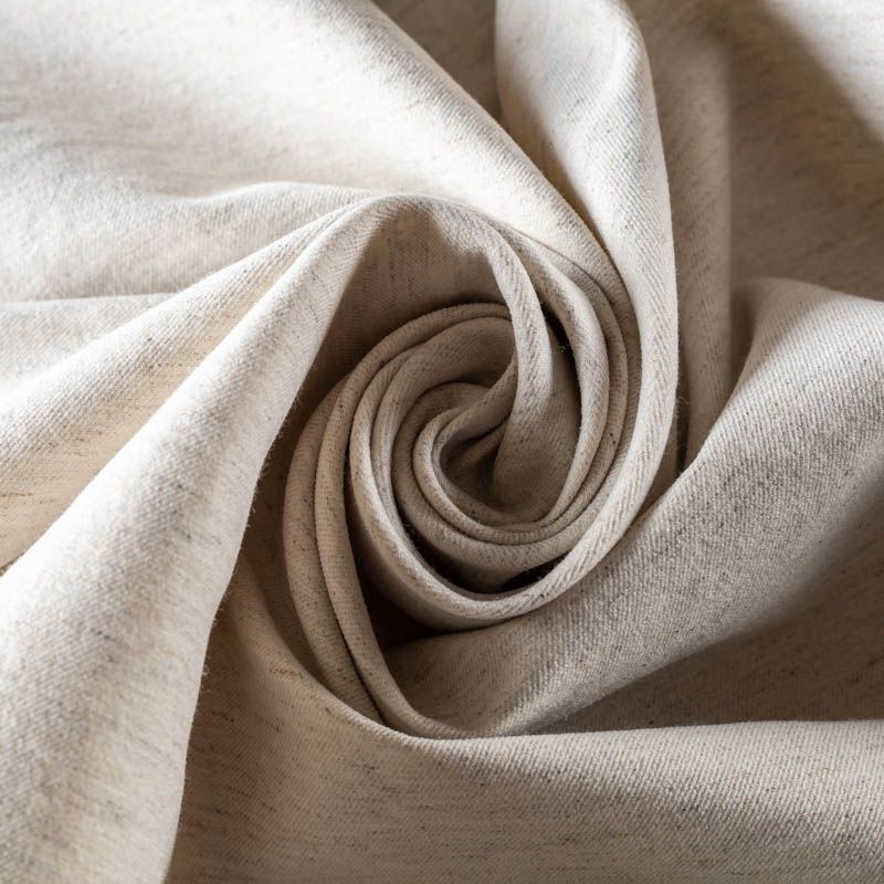 Костюмно-плательный полулен молочного оттенка с серыми вкраплениями. Ткань плотная, но мягкая и пластичная, поверхность матовая, твиловая. Приятная на ощупь, держит форму, отлично тянется. Прекрасный вариант для платьев облегающеего силуэта, сарафанов, костюмов, юбок, брюк или шорт.