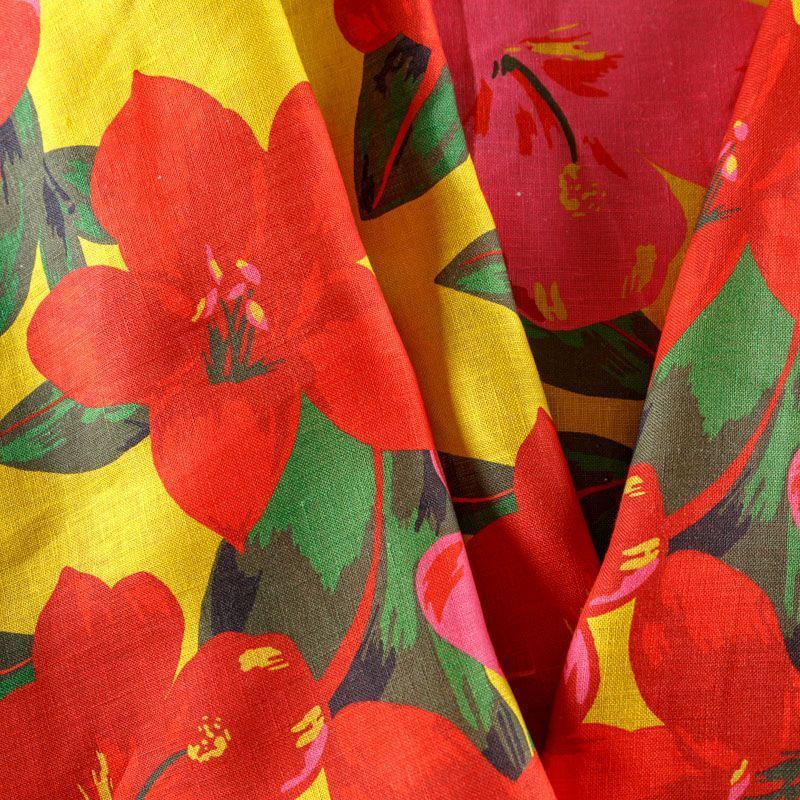 Итальянский плательно-рубашечный лен с добавлением вискозы средней плотности с крупным цветочным принтом в ярких оттенках. Ткань прочная, имеет матовую рельефную поверхность и полотняное переплетение, немного просвечивает, отлично держит форму, пластичная, комфортная в изделии. Отлично подойдет для пошива для летних костюмов, рубашек, туник, платьев, сарафанов, юбок, жакетов, брюк или шорт.