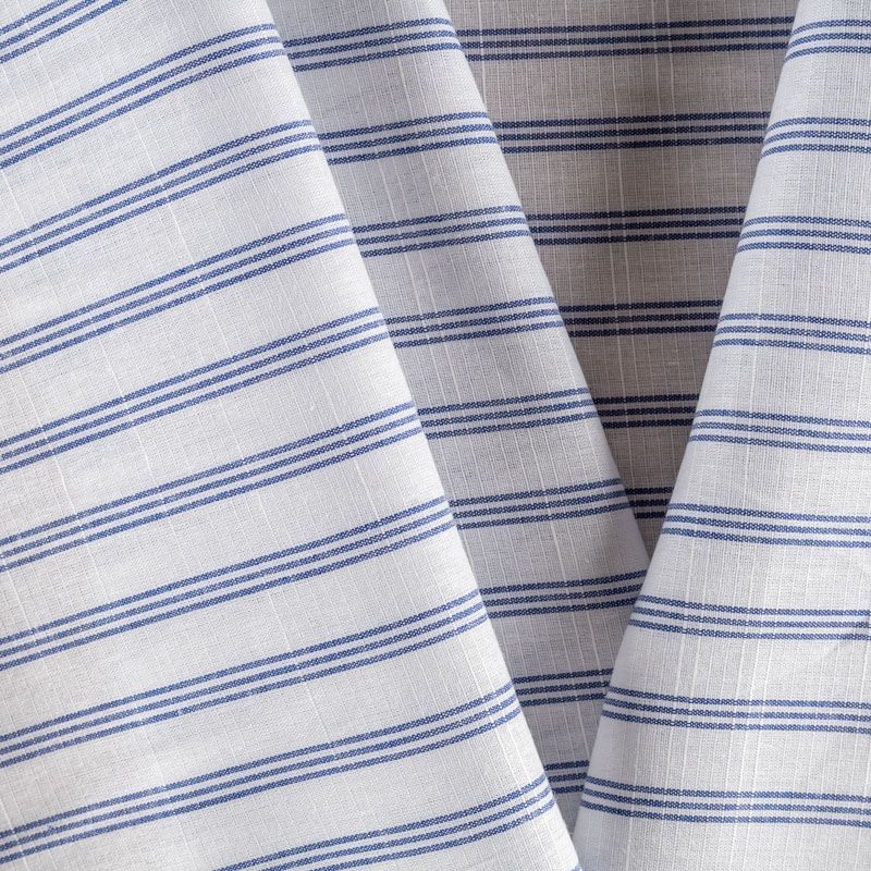 Ткань лёгкая, непрозрачная, поверхность матовая имеет льняную текстуру, приятная к телу, хорошо драпируется. По назначению -  для юбки, платья-рубашки, сарафана, туники. На белом фоне тройная тонкая полоска темно-синего цвета расположена вдоль кромки.