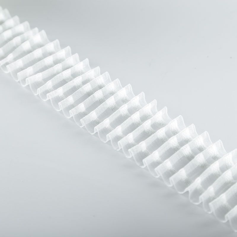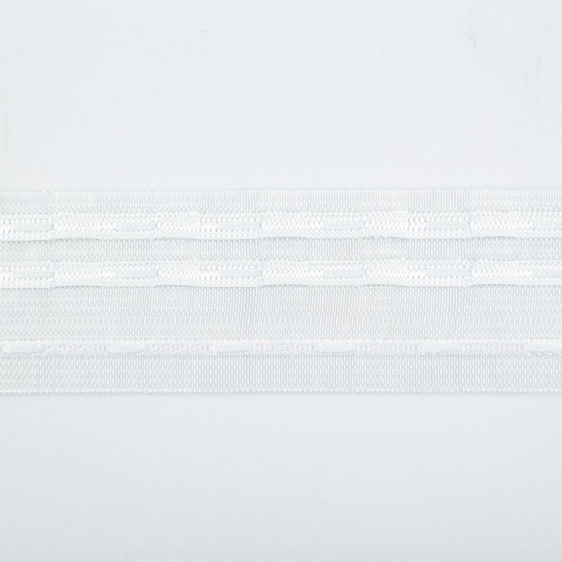 Шторная лента прозрачная для тюлей и портьерных тканей с карандашной сборкой. Сокращение - 1:2,5, раппорт - 25 см, 2 ряда непрозрачных белых кармашков, крепление - крючки.