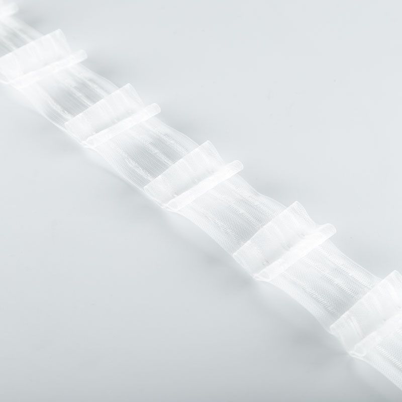 Шторная лента полностью прозрачная для тюлей и портьерных тканей с двойной бантовой складкой. Сокращение - 1:2, раппорт - 16 см, расстояние между складками - 8 см, 2 ряда кармашков, крепление - крючки.
