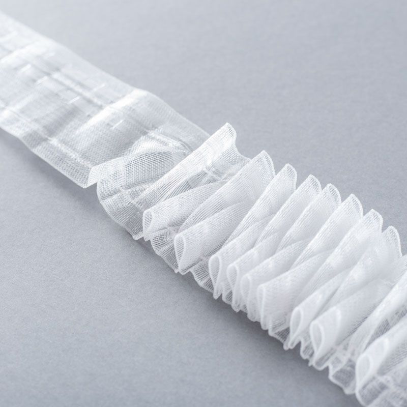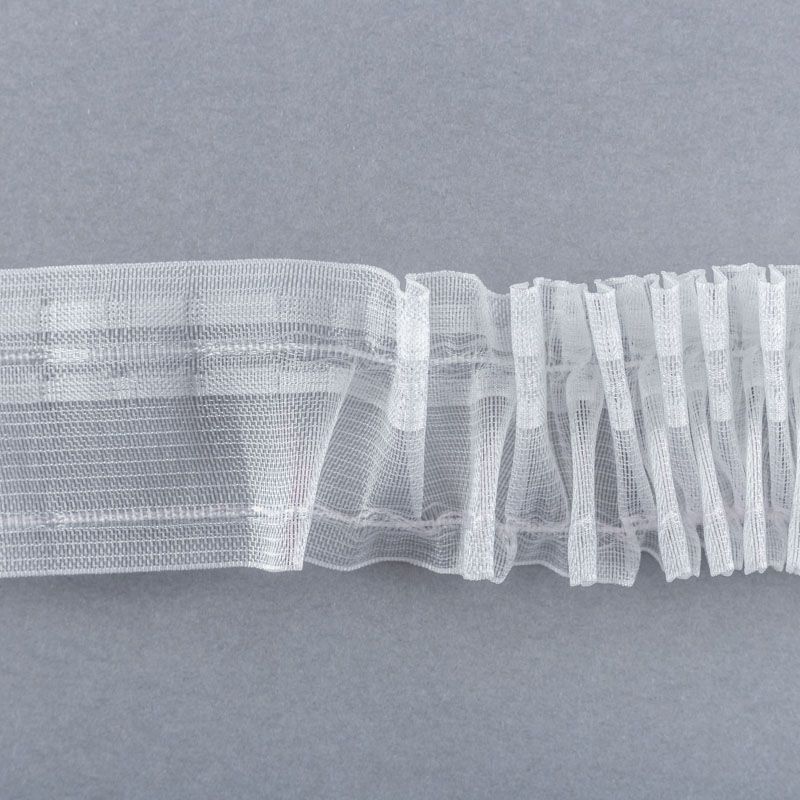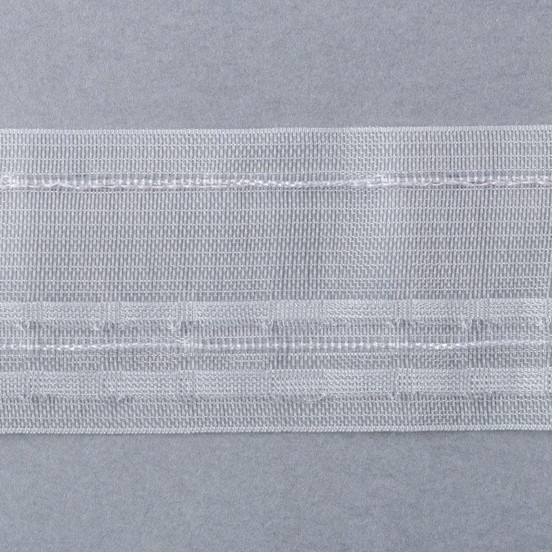 Шторная лента полностью прозрачная для тюлей и легких портьерных тканей c вафельной складкой. Сокращение - 1:2, раппорт - 6 см, 2 ряда кармашков, крепление - крючки.
