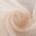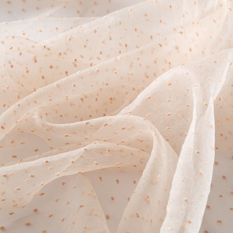 Легчайший, изящный, воздушнный и прозрачный материал с благородной переливчатой поверхностью. Прекрасно держит форму в заложеных складках. На лицевой стороне объемные декоративные элементы из флока диаметром 0.5 см. Подойдет для создания в изделии декоративных деталей, новогодних костюмов, нарядных платьев, блузок.