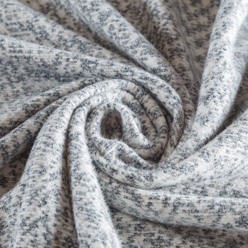 Плотный двухслойный пальтовый трикотаж белого цвета с геометрическим орнаментом серого оттенка. Ткань очень приятная на ощупь, пластичная, теплая и уютная, поверхность мягкая и шелковистая. Изнанка однотонная молочного оттенка. Прекрасно подойдет для  пошива пальто, теплых жакетов, курток, кардиганов, костюмов.