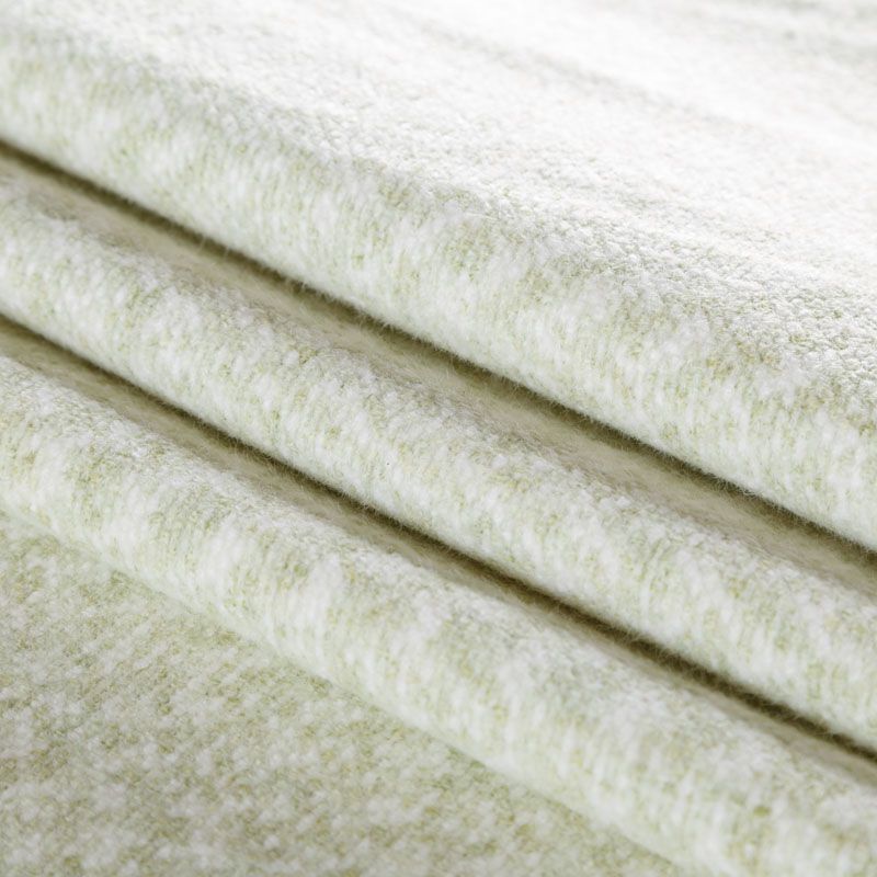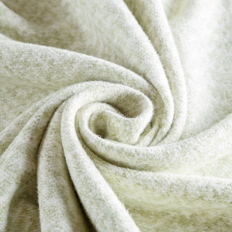 Плотный двухслойный пальтовый трикотаж белого цвета с геометрическим орнаментом светло-зеленого оттенка. Ткань очень приятная на ощупь, пластичная, теплая и уютная, поверхность мягкая и шелковистая. Изнанка однотонная молочного оттенка. Прекрасно подойдет для пошива пальто, теплых жакетов, курток, кардиганов, костюмов.