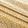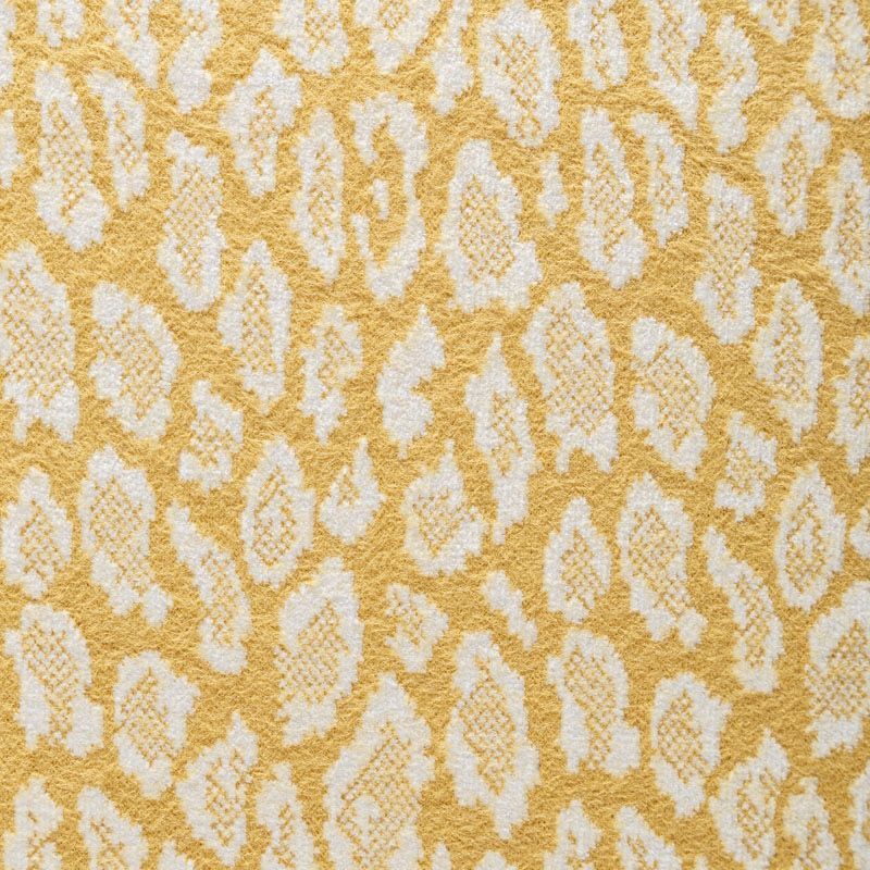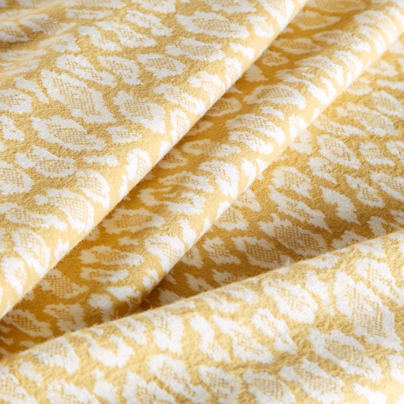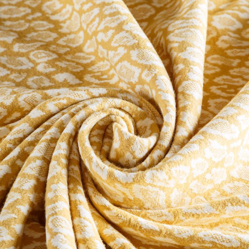 Плотный двухслойный пальтовый трикотаж желтого оттенка со стилизованным анималистическим узором белого цвета. Ткань очень приятная на ощупь, пластичная, теплая и уютная, поверхность мягкая и шелковистая. Изнанка однотонная молочного оттенка. Прекрасно подойдет для  пошива пальто, теплых жакетов, курток, кардиганов, костюмов.