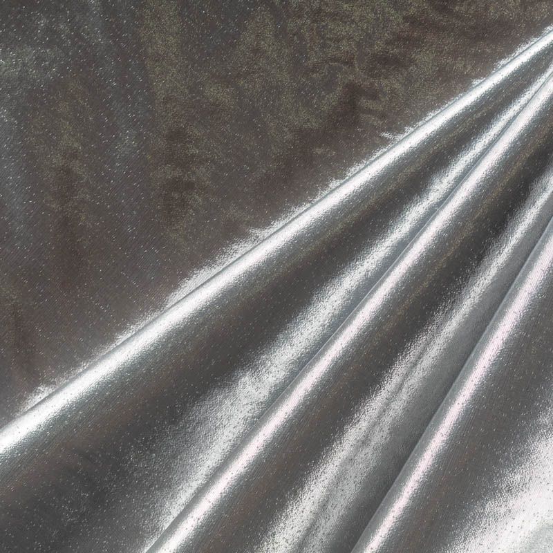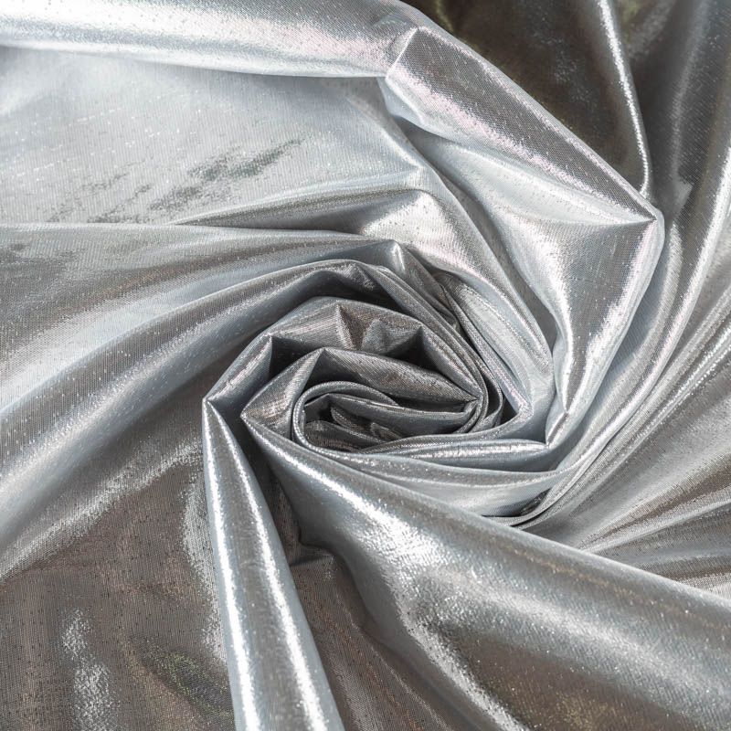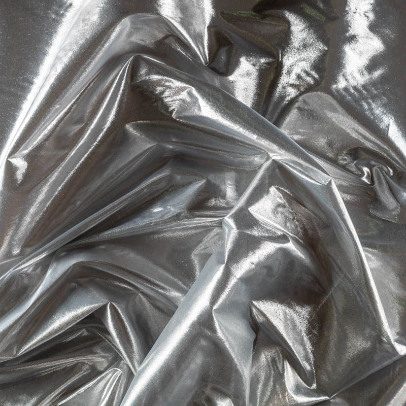 Тонкая, очень легкая ткань, похожая по внешнему виду на жидкий металл. Полотно шуршащее, переливается серебром, ткань хорошо держит форму, не мнётся, немного просвечивает. Отлично подойдёт для пошива театральных и парадных костюмов и декорирования изделий.