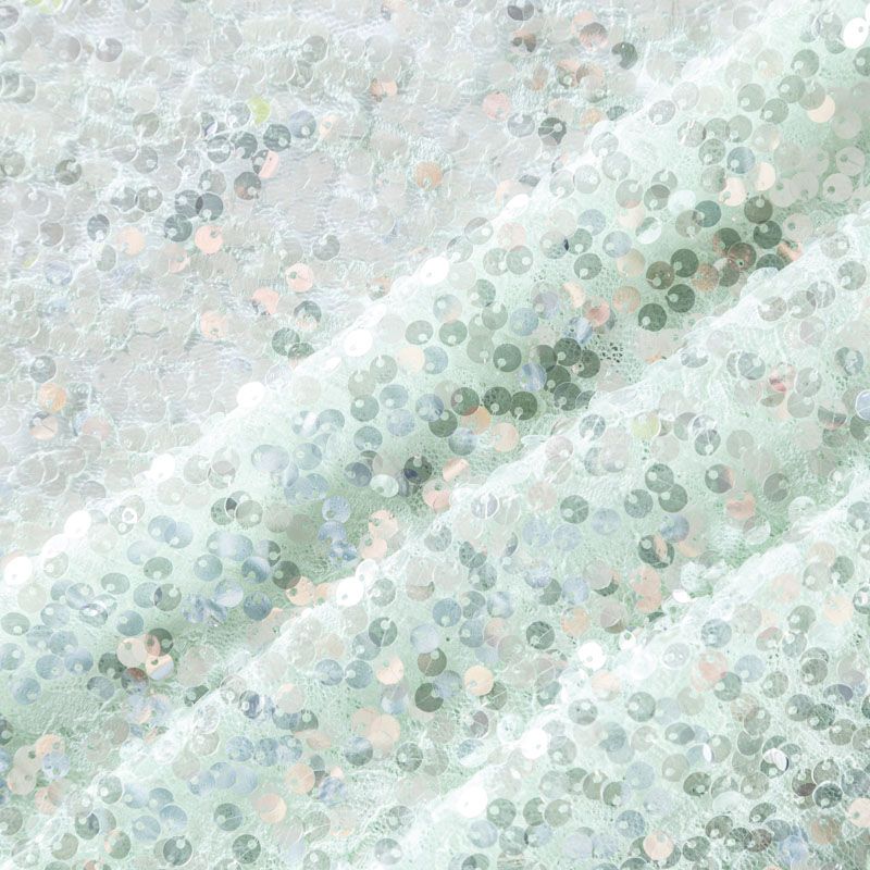 Итальянское ажурное кружевное полотно мятного оттенка с цветочным рисунком и нашитыми на него прозрачными глянцевыми пайетками с лицевой стороны. Ткань полупрозрачная, требуется подклад. Очень мягкая и пластичная, эффектно переливается при движении, хорошо драпируется. Пайетки — идеальный материал для праздников и вечеринок. Из них получится эффектное платье, туника, топ, юбка или комбинезон.