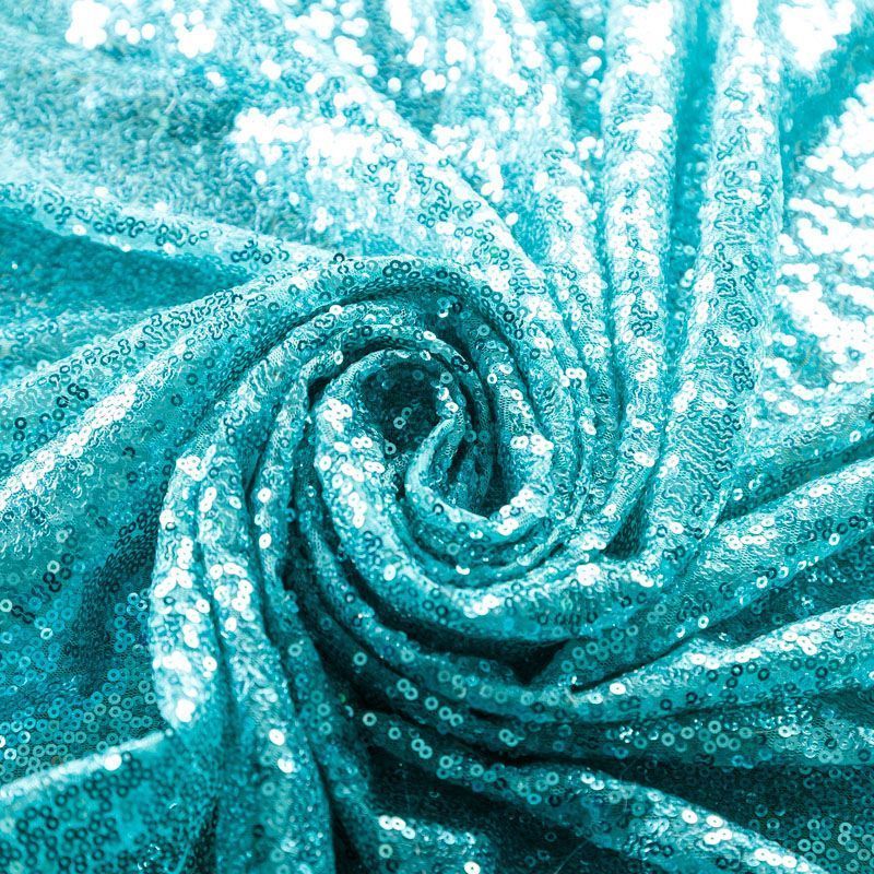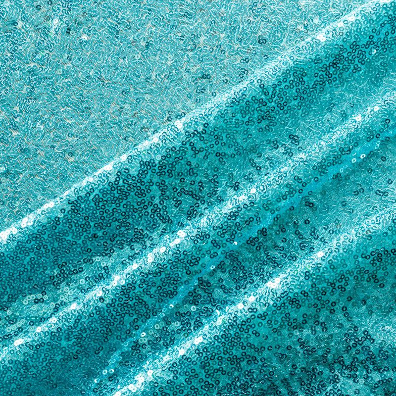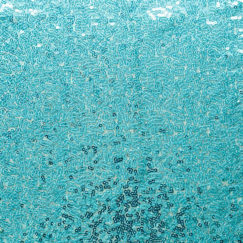 Блестящие пайетки в бирюзовом оттенке. Мелкие, размером около 3 мм, расположены в хаотичном порядке. Основа - мягкая и эластичная сетка. Ткань полупрозрачная, может потребоваться подклад. Подойдет для вечернего, коктейльного платья, юбки, нарядных детских изделий, танцевальных и сценических костюмов.
