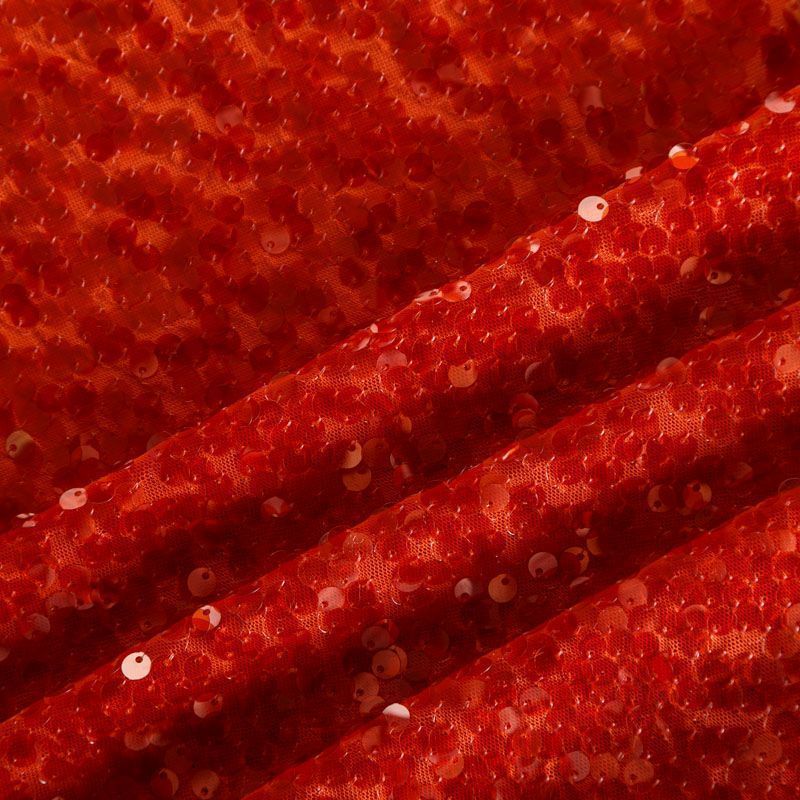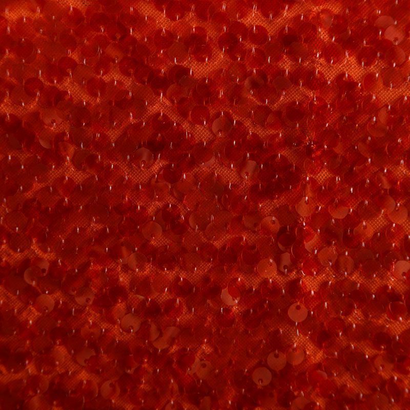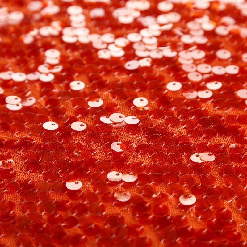 Тонкая эластичная сетка темно-оранжевого оттенка по всей поверхности усеяна полупрозрачными пайетками в тон основе. Ткань очень хорошо драпируется, красиво переливается, пластичная и эластичная и в длину, и в ширину, благодаря чему изделия получаются комфортными и отлично сидят по фигуре. Пайетки — идеальный материал для праздников и вечеринок, также отлично впишутся в стиль "спорт-шик". Из них получится эффектное платье, жакет, боди, топ, туника, юбка или комбинезон.