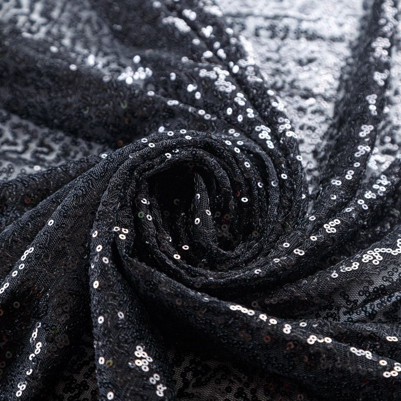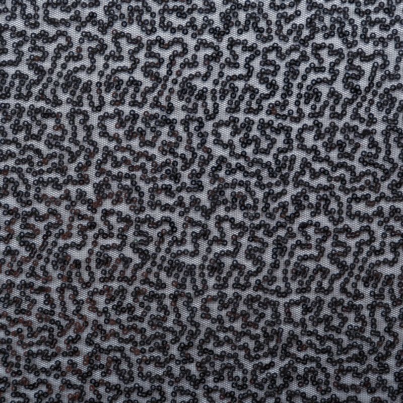 Тонкая эластичная сетка черного цвета расшита мелкими глянцевыми пайетками в тон основе. Ткань очень хорошо драпируется, красиво переливается, пластичная и эластичная и в длину, и в ширину, благодаря чему изделия получаются комфортными и отлично сидят по фигуре. Пайетки — идеальный материал для праздников и вечеринок. Из них получится эффектное платье, жакет, боди, топ, туника, юбка или комбинезон.