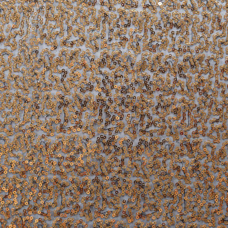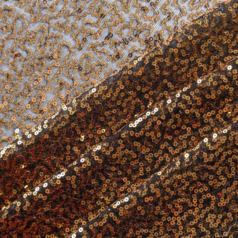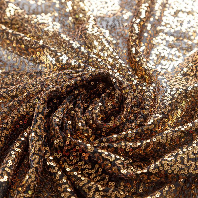 Тонкая эластичная сетка черного цвета расшита мелкими глянцевыми пайетками бронзового оттенка. Ткань очень хорошо драпируется, красиво переливается, пластичная и эластичная и в длину, и в ширину, благодаря чему изделия получаются комфортными и отлично сидят по фигуре. Пайетки — идеальный материал для праздников и вечеринок. Из них получится эффектное платье, жакет, боди, топ, туника, юбка или комбинезон.