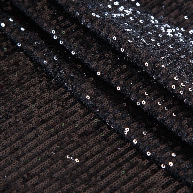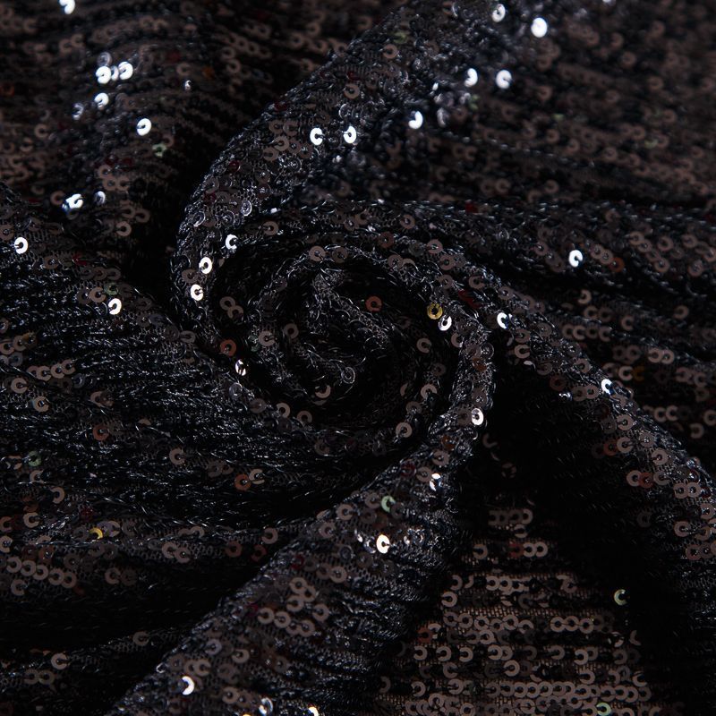Нашитые полосками мелкие пайетки расположены от кромки до кромки. Ткань набирается на изделие объемом.