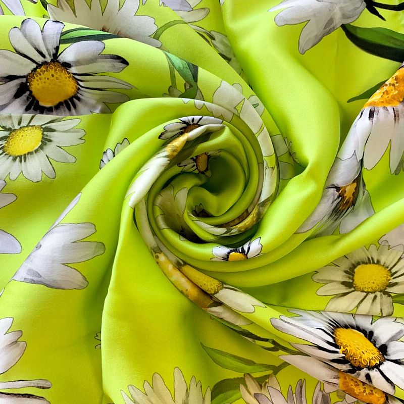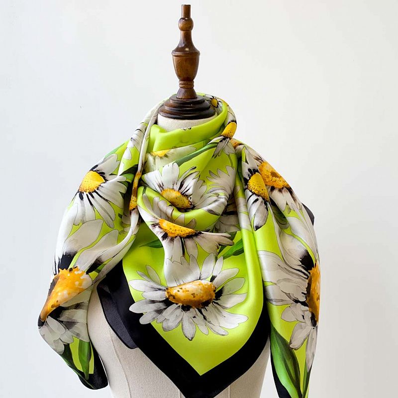 Эффектный и стильный платок с крупными ромашками на ярком салатовом фоне с черным кантом. Платок выполнен из натурального итальянского шелка атласного плетения. Такой аксессуар добавит свежести и весеннего настроения в Ваш образ.
