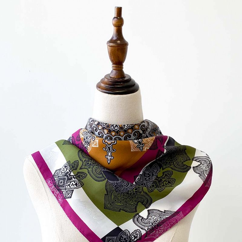 Платок выполнен из натурального итальянского шелка с этническим орнаментом на фоне сочетания цветных квадратов. Невесомый, воздушный, мягкий и пластичный, летящий, поверхность с красивым матовым блеском. Будет отличным стильным аксессуаром к платью, костюму, жакету или пальто.