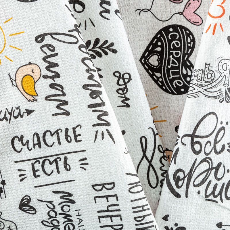 Качественная натуральная хлопчатобумажная ткань, обладающая высокой гигроскопичностью, с скетч-принтом в монохромной гамме. Универсальный материал, из которого  шьют кухонные полотенца, скатерти, прихватки, салфетки.
