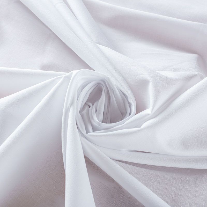 Однотонный плательно-рубашечный хлопковый поплин белоснежного оттенка. Ткань лёгкая, слегка прозрачная, поверхность матовая, гладкая, приятная к телу, хорошо драпируется, тянется за счет эластана в составе. Прекрасно подойдет блузы, платья-рубашки, летнего сарафана, туники.