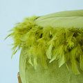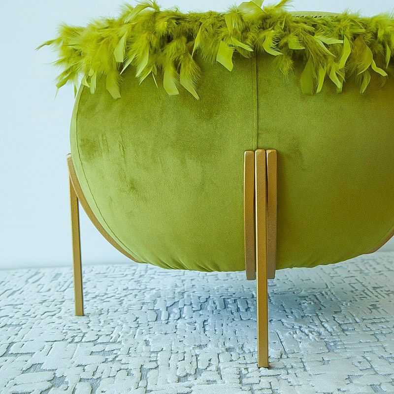 Ориганальный дизайнерский пуф выполнен из бархата грушевого оттенка, декорирован кантом и перьями. Ножки выполнены из окрашенного металлического профиля. Диаметр сидения - 50 см, диаметр в основании - 65 см, высота от пола - 51 см.