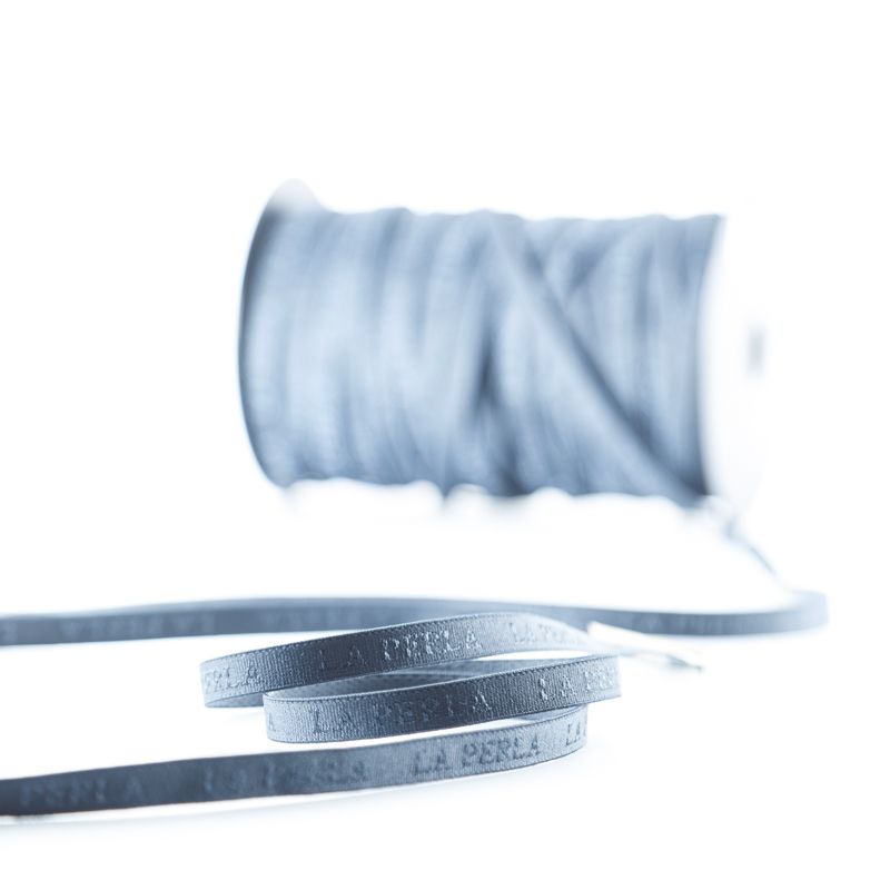 Бретелечная резинка используется для обработки стана бюстгальтера, а также для бретелей. Матовая с жаккардовой надписью бренда. Края ровные.