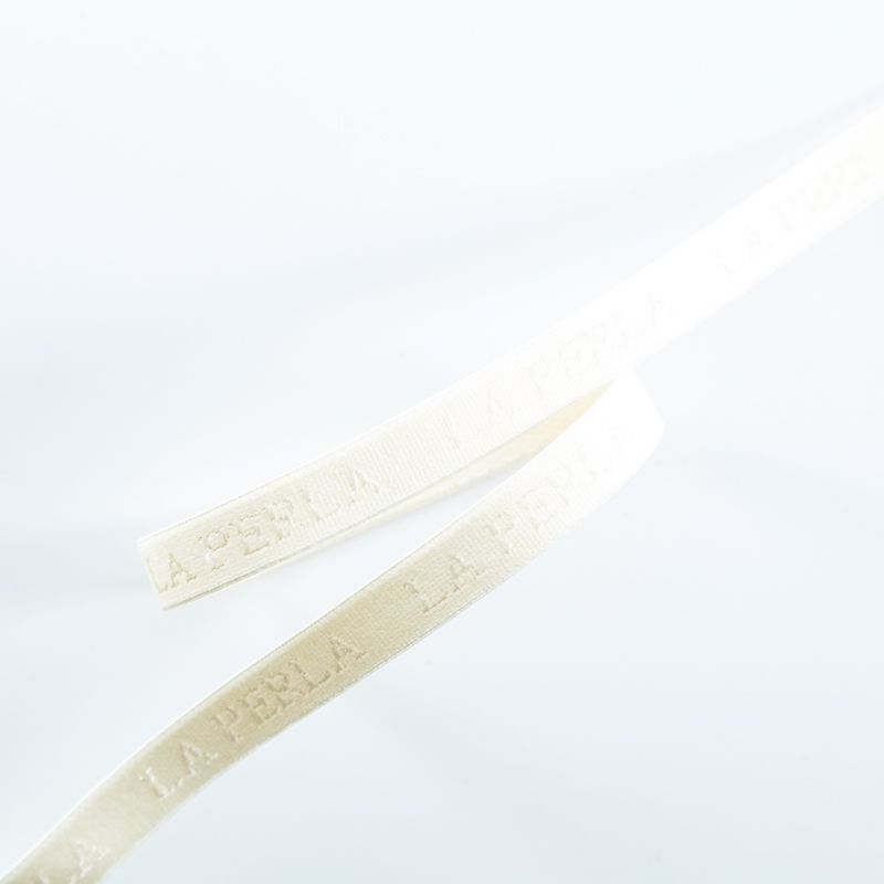 Бретелечная резинка используется для обработки стана бюстгальтера, а также для бретелей. Матовая с жаккардовой надписью бренда. Края ровные.