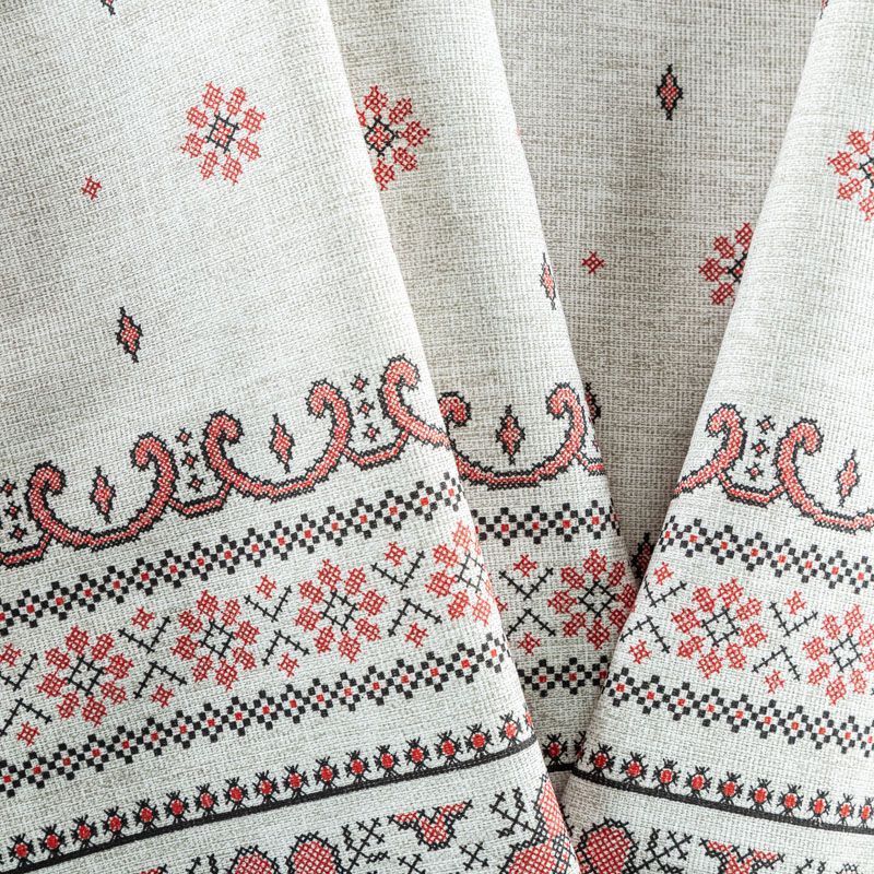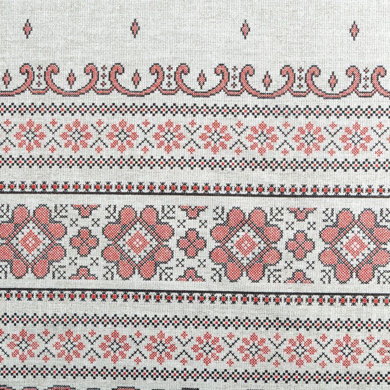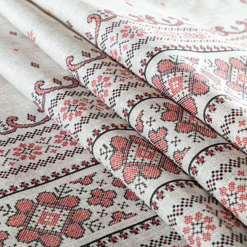 Ткань рогожка с имитацией вышивки крестиком на сером фоне. Это плотная хлопковая ткань с переплетением нитей две на две, благодаря этому создаётся структурное полотно отлично подходящее для пошива скатертей и салфеток, фартуков, сценических костюмов. Набирается объемом.