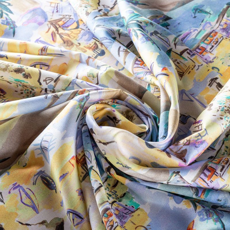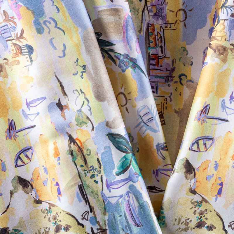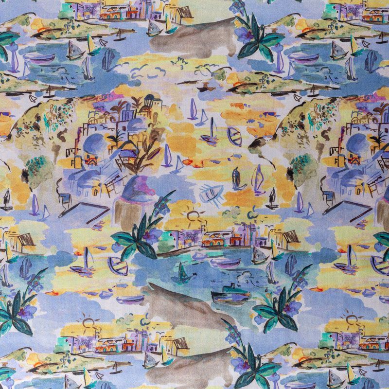 Блузочно-рубашечный хлопок сатинового плетения с акварельным морским пейзажем, который переносит нас на средиземноморское побережье Италии. Ткань тонкая, легкая, слегка прозрачная, мягкая и шелковистая на ощупь. Сатин очень пластичный, хорошо драпируется, немного держит форму. Подойдет для пошива различных предметов летнего гардероба: платья, сарафана, туники, рубашки, топа.