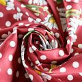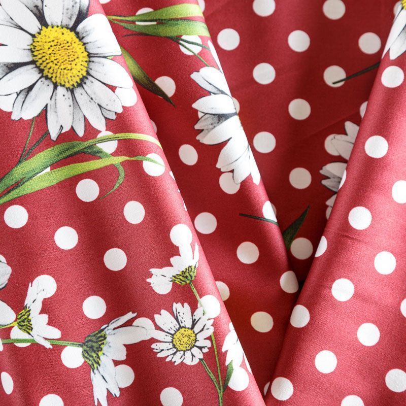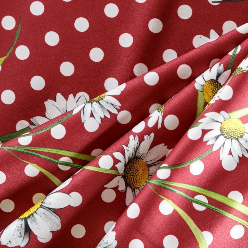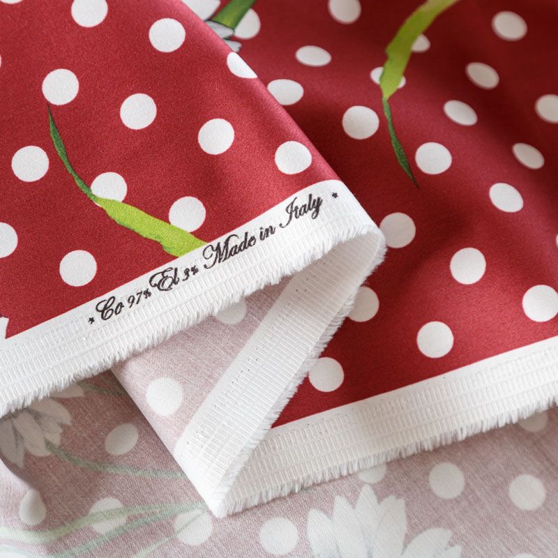 Итальянский сатин-коттон бордового цвета с крупным цветочным принтом. Поверхность гладкая со сдержанным блеском, ткань средней плотности, не толстая, хорошо держит форму, тянется за счет эластана в составе. Подойдет для пошива костюма, жакета, юбки, платья, брюк или шорт.