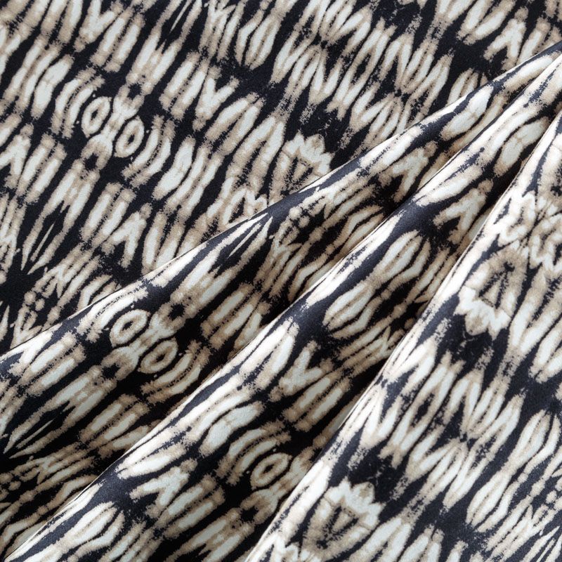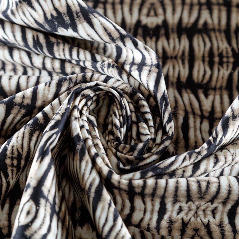 Итальянский сатин-коттон в серо-бежевых оттенках с абстрактным принтом. Поверхность гладкая со сдержанным блеском, ткань средней плотности,  не толстая, хорошо держит форму, тянется за счет эластана в составе. Подойдет для пошива костюма, жакета, юбки, платья, брюк или шорт.