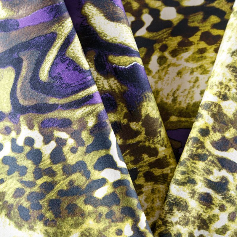 Итальянский сатин-коттон оливкового оттенка с контрастным анималистическим принтом. Поверхность гладкая со сдержанным блеском, ткань средней плотности, не толстая, хорошо держит форму, тянется за счет эластана в составе. Подойдет для пошива костюма, жакета, юбки, платья, брюк или шорт.