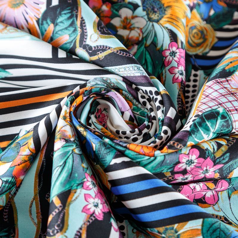 Сатин-коттон в мятном цвете с абстрактно-цветочным принтом. Поверхность гладкая со сдержанным блеском, ткань средней плотности, не толстая, хорошо держит форму, тянется за счет эластана в составе. Подойдет для пошива костюма, жакета, юбки, платья, брюк или шорт.