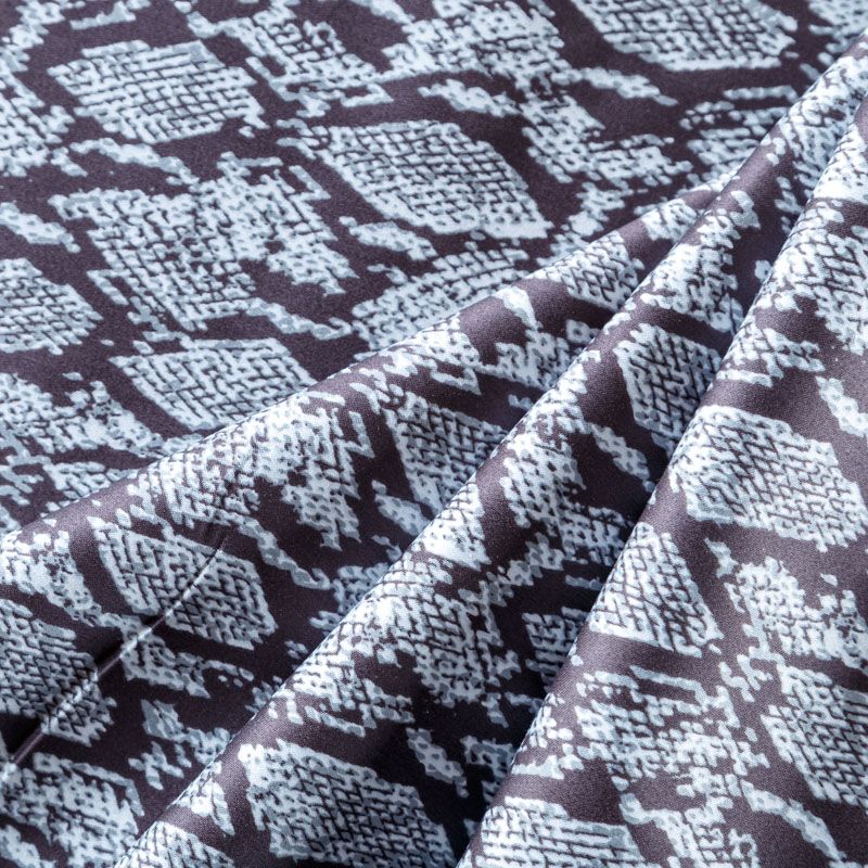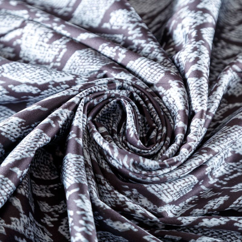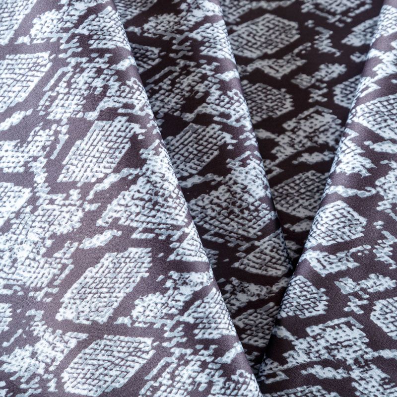 Сатин-коттон черного цвета со стилизованным анималистическим принтом, с гладкой поверхностью со сдержанным блеском, ткань средней плотности,  не толстая, хорошо держит форму, тянется за счет эластана в составе. Подойдет для пошива костюма, жакета, юбки, платья, брюк или шорт.
