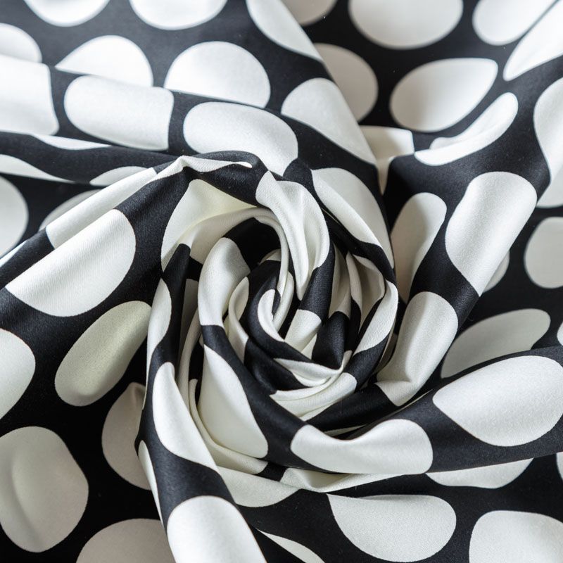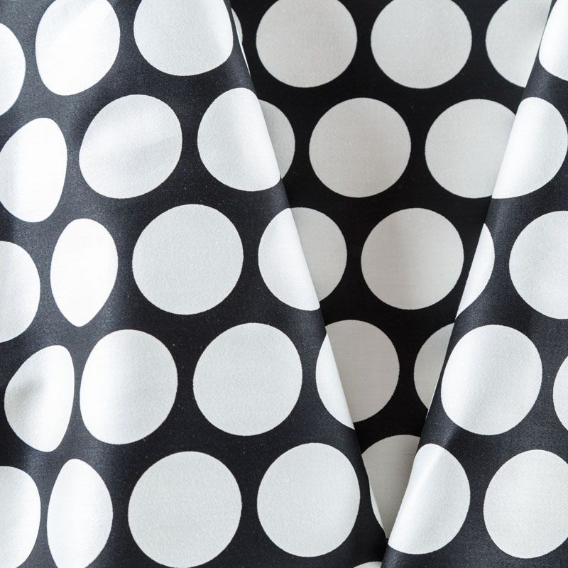 Сатин-коттон черного цвета с крупным принтом в горох, с гладкой поверхностью со сдержанным блеском, ткань средней плотности,  не толстая, хорошо держит форму, тянется за счет эластана в составе. Подойдет для пошива костюма, жакета, юбки, платья, брюк или шорт.