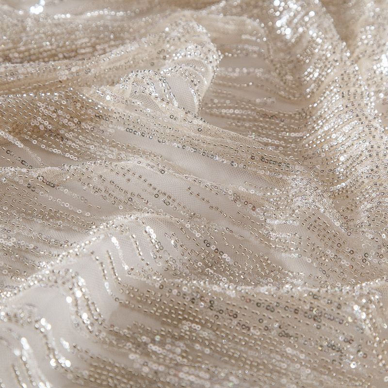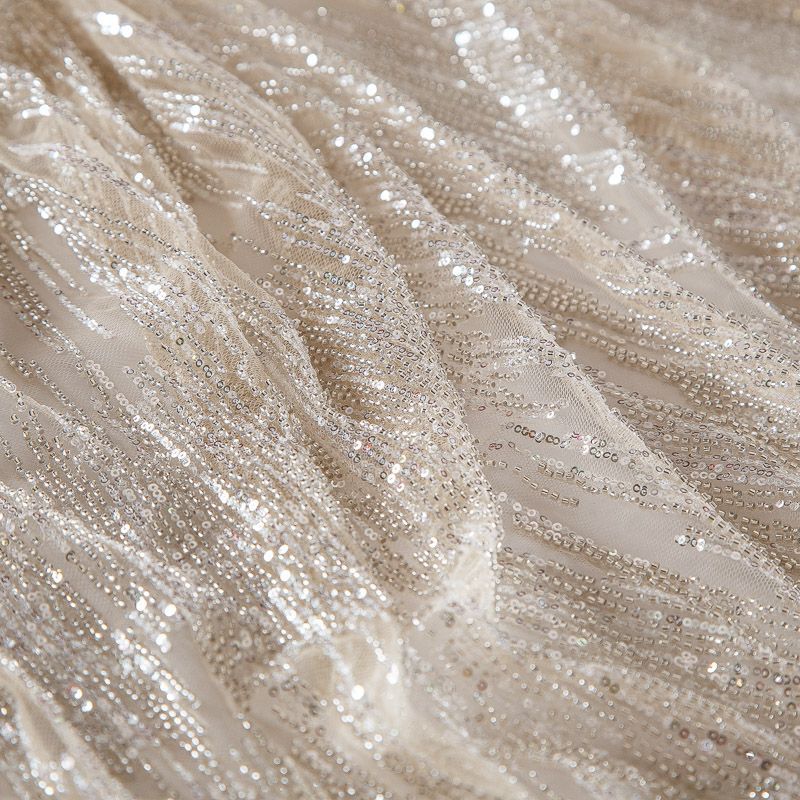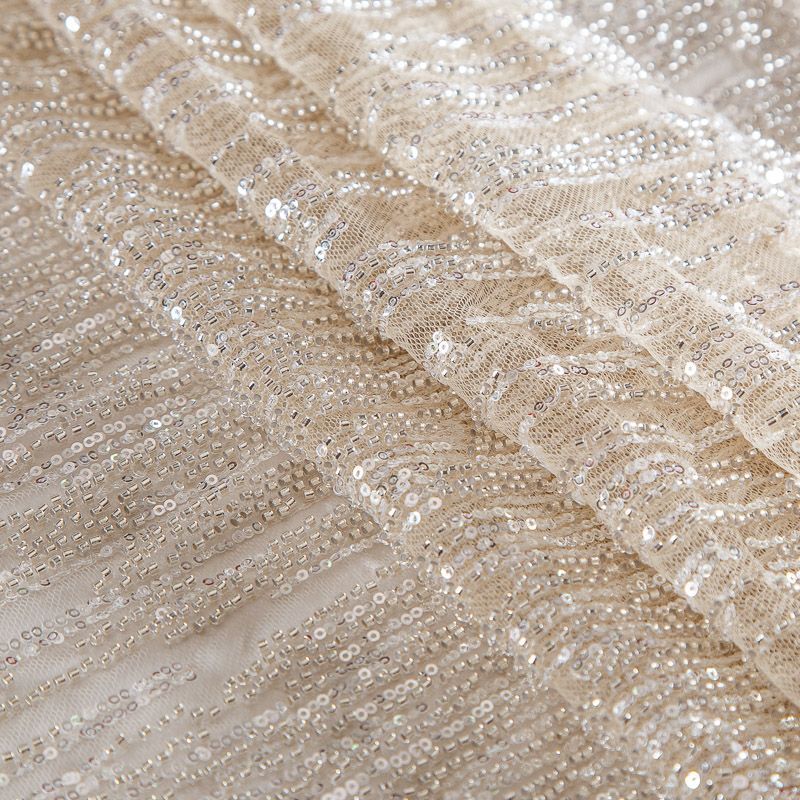 Мягкая сетка, густо расшитая пайетками и стеклярусом в тон полотна. Узор напоминает северное сияние, расположен по ширине полотна. Подходит для пошива нарядной одежды, платья, юбки, комбинезона. Требуется подклад, материал набирается объемом.