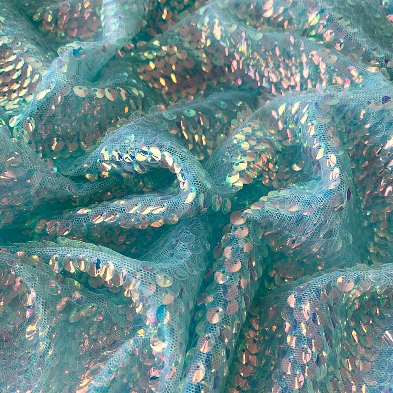 Тонкая эластичная сетка мятного цвета по всей поверхности усеяна объемными глянцевыми "бензиновыми" пайетками. Ткань очень хорошо драпируется, красиво переливается, имеет глянцевый блеск, пластичная и эластичная и в длину, и в ширину, набираются объемом. Пайетки — идеальный материал для праздников и вечеринок. Из них получится эффектное платье, жакет, боди, туника, юбка или комбинезон.