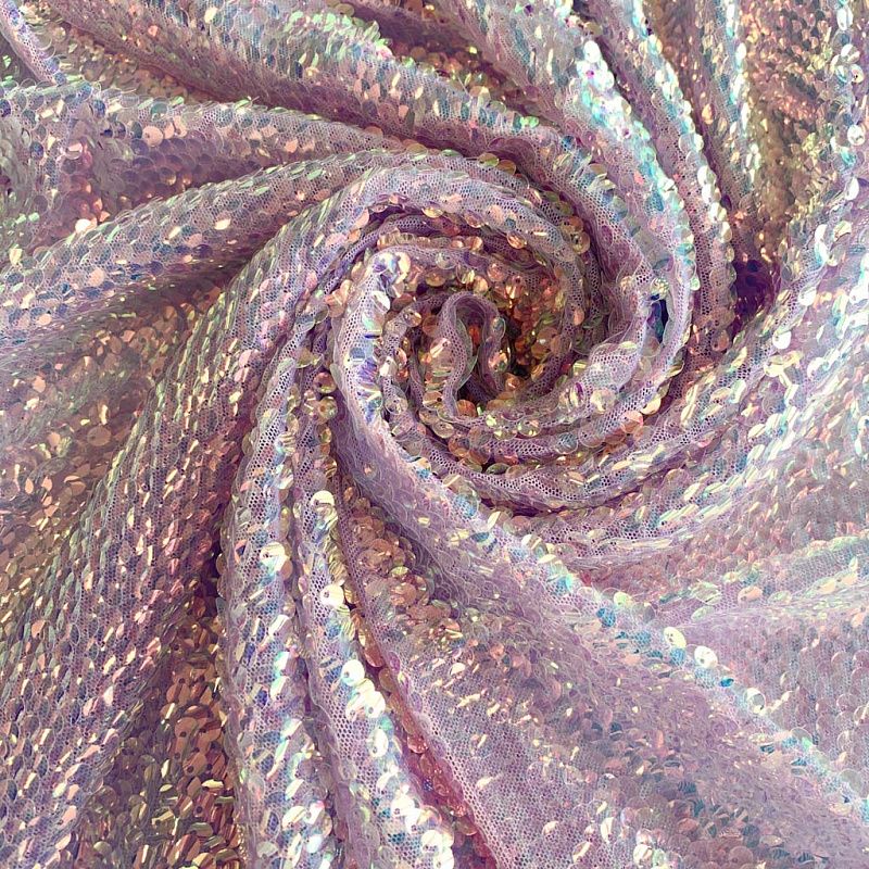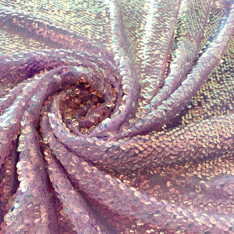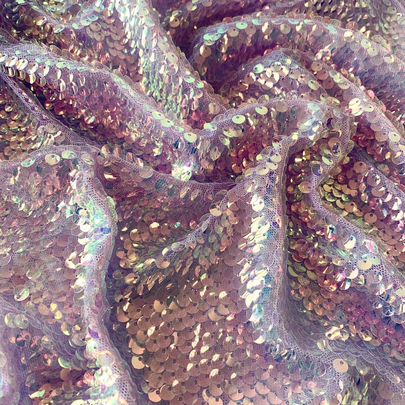 Тонкая эластичная сетка сиреневого цвета по всей поверхности усеяна объемными глянцевыми "бензиновыми" пайетками. Ткань очень хорошо драпируется, красиво переливается, имеет глянцевый блеск, пластичная и эластичная и в длину, и в ширину, набираются объемом. Пайетки — идеальный материал для праздников и вечеринок. Из них получится эффектное платье, жакет, боди, туника, юбка или комбинезон.