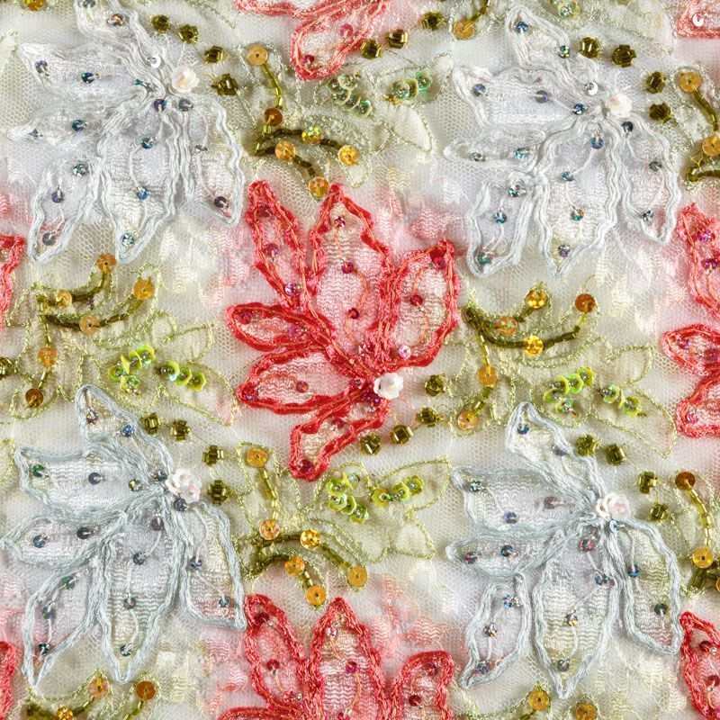 Итальянское полотно белого цвета с цветочным объемным узором, вышитом на тонкой сетке с мелкой ячейкой, сетка мягкая, пластичная, матовая, не держит форму. Дополнительно вышивка декорирована мелкими глянцевыми пайетками. Прекрасно подойдет для вечерних платьев, юбок, топов, бюстье. Эффектно смотрится на теле без подкладочной ткани, например, рукава платья.