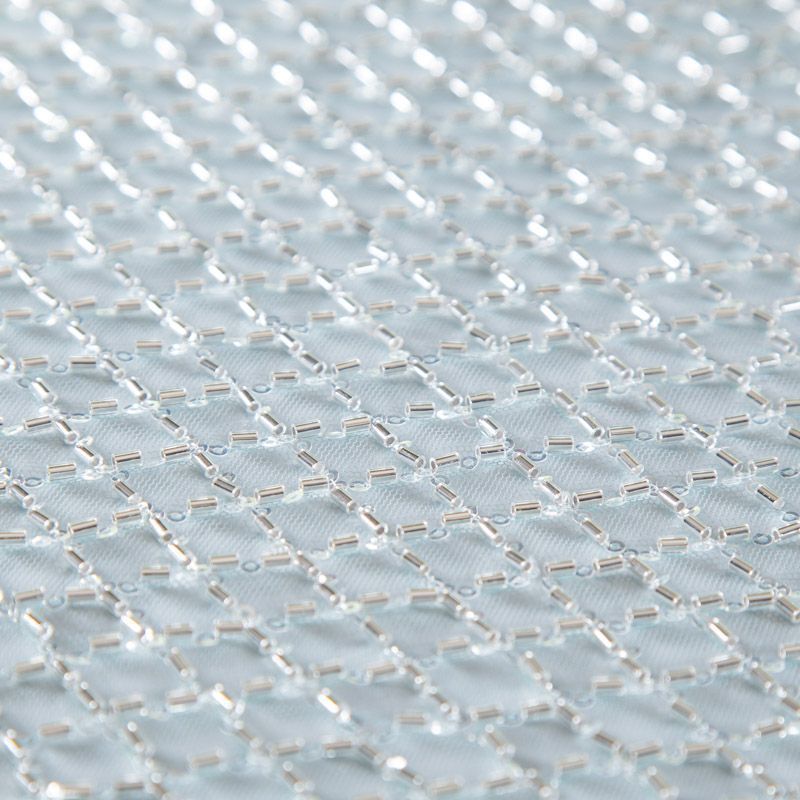 Эластичная мягкая сетка мятного оттенка, расшитая прозрачным стеклярусом. Геометрический дизайн делает полотно универсальным в использовании. Итальянская сетка прекрасно подходит для пошива праздничных нарядов, платьев, юбок и топов для торжественных случаев, а также отделки аксессуаров.