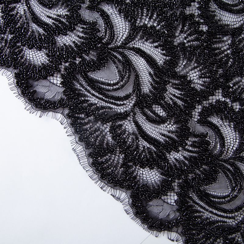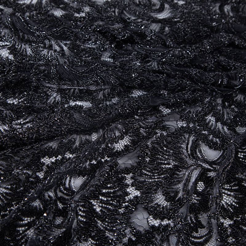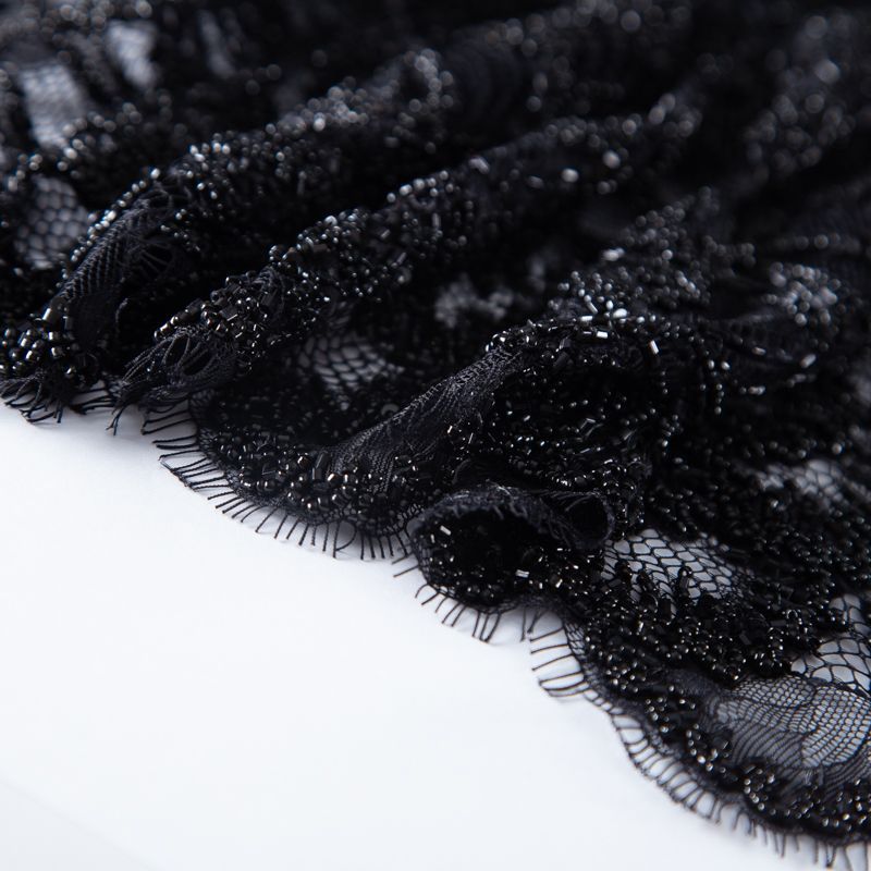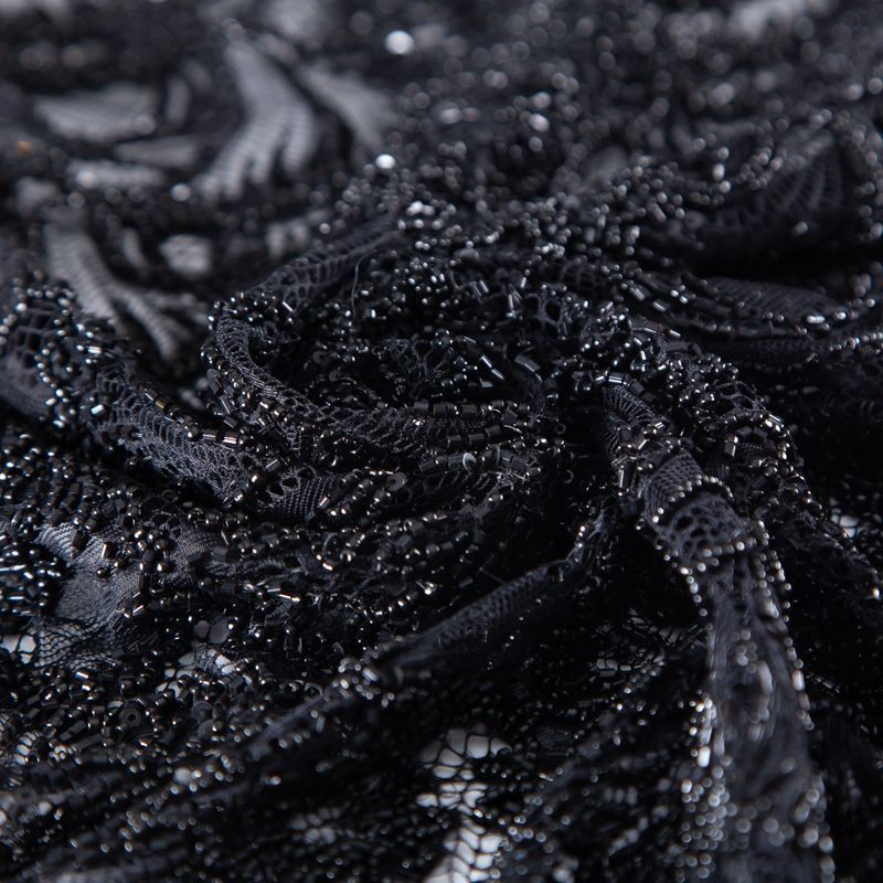 Нежнейшее итальянское кружево с насыщенной вышивкой по всему полотну. Мерцание цветочному узору придает нашитый стеклянный черный глянцевый бисер. Край полотна - фестон с "ресничками". Набирается на изделие объемом.