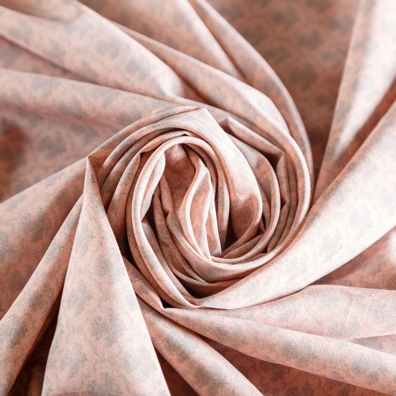Очень красивый и нежный шелковый батист с добавлением хлопка в пудрово-розовом оттенке с абстрактным принтом. Ткань тонкая, мягкая и легкая, не прозрачная, ее прикосновения к телу очень приятны, в изделии из него будет комфортно как в жару, так и в прохладную погоду. Лицевая сторона гладкая, с легким сатиновым блеском. Прекрасно подойдет для пошива летнего сарафана, платья, блузки, топа, туники, костюма в пижамном стиле, широких брюк или юбки.