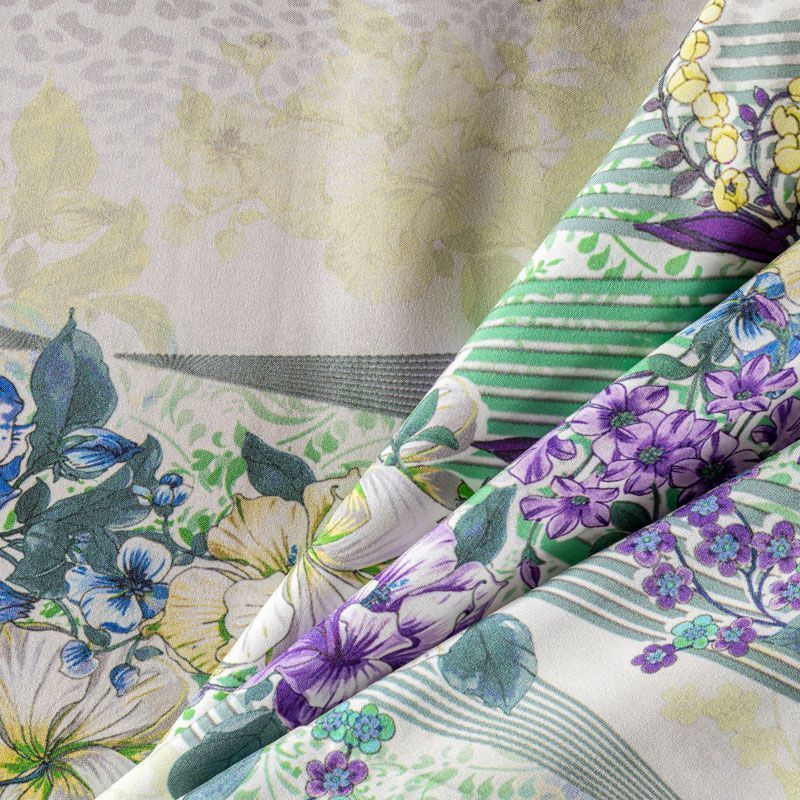 Итальянский матовый шелк с насыщенным по составу принтом: сочетание геометрических линий, анималистического и растительного рисунка на молочном фоне, тонкий, слегка прозрачный, отлично драпируется, легкий и струящийся с креповой поверхностью. Идеально подойдет для пошива платьев и сарафанов расклешенных моделей, с воланами, летящих юбок, топов, блузки, костюма в пижамном стиле, домашней одежды.