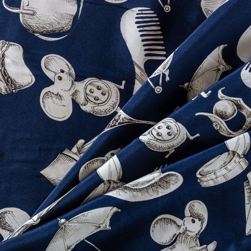 Итальянский матовый шелк глубокого оттенка сапфира с узнаваемым игривым принтом от известного бренда. Ткань тонкая, не просвечивается, отлично драпируется, легкая и струящаяся, тянется за счет эластана в составе, лицевая сторона креповая, изнанка - атласная. Идеально подойдет для пошива платьев и сарафанов расклешенных моделей, с воланами, рюшами, летящих юбок, топов, блузки, рубашки, костюма в пижамном стиле.