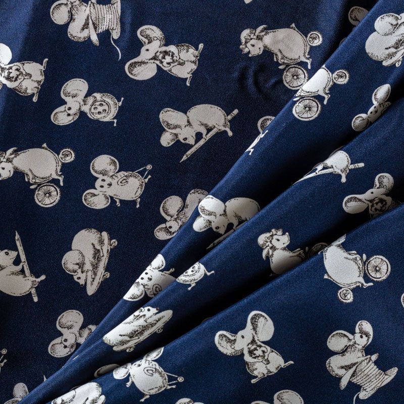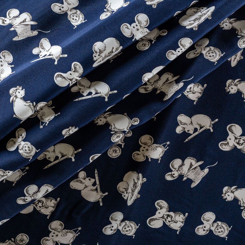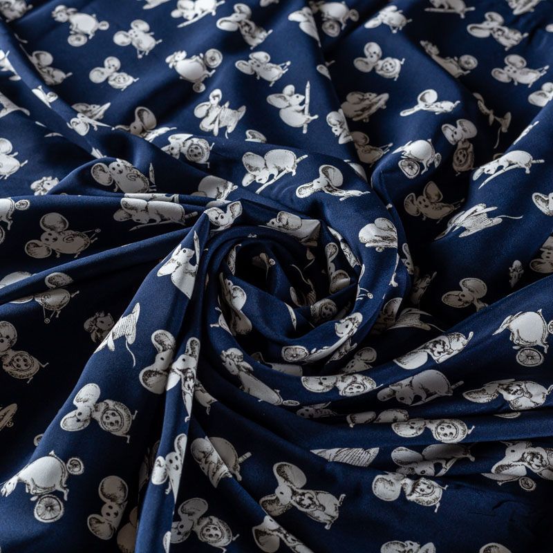 Итальянский матовый шелк темно-синего оттенка с узнаваемым игривым принтом от известного бренда. Ткань тонкая, не просвечивается, отлично драпируется, легкая и струящаяся, тянется за счет эластана в составе, лицевая сторона креповая, изнанка - атласная. Идеально подойдет для пошива платьев и сарафанов расклешенных моделей, с воланами, рюшами, летящих юбок, топов, блузки, рубашки, костюма в пижамном стиле.