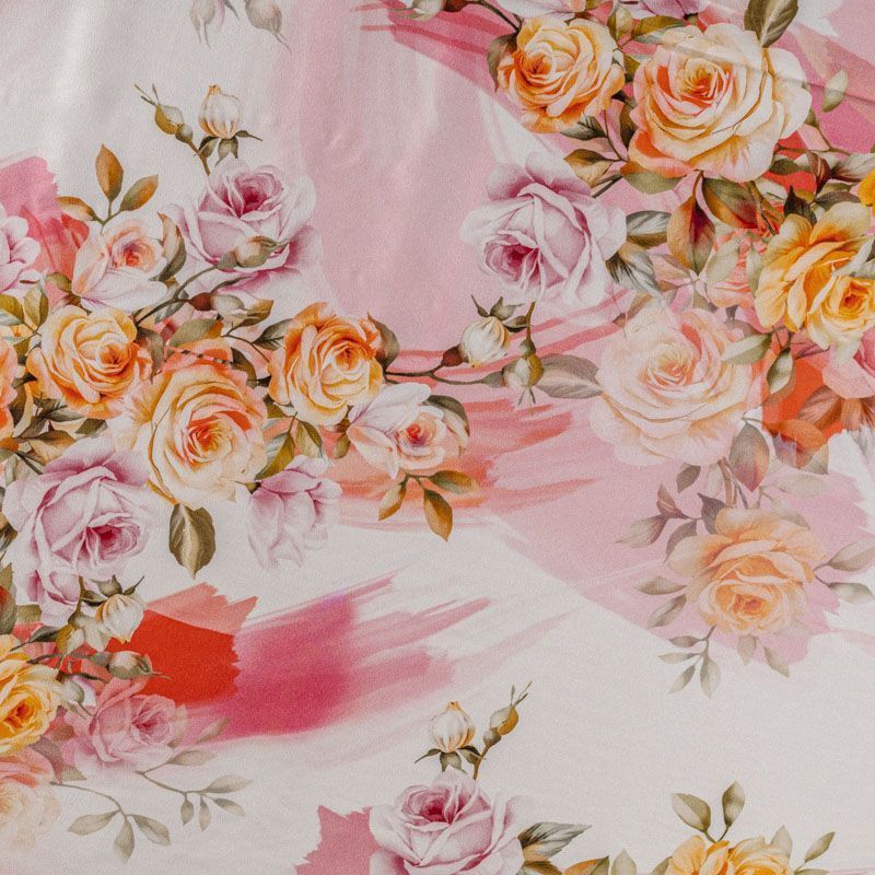Итальянский шелк с цветочным принтом в нежных оттенках на белом фоне, тонкий, слегка прозрачный, отлично драпируется, тянется за счет эластана в составе, легкий и струящийся с атласной поверхностью. Идеально подойдет для пошива платьев и сарафанов расклешенных моделей, с воланами, летящих юбок, топов, блузы, костюма в пижамном стиле.