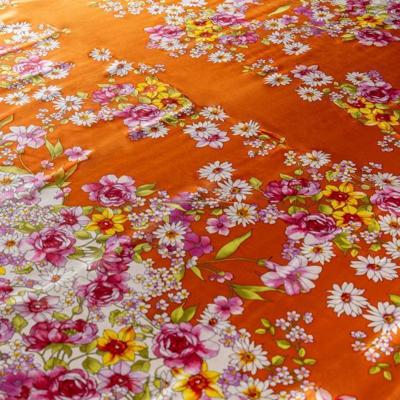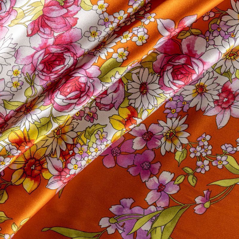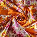 Итальянский шелк с цветочным принтом на ярком оранжевом фоне, тонкий, не просвечивает, отлично драпируется, легкий и струящийся с атласной поверхностью. Идеально подойдет для пошива платьев и сарафанов расклешенных моделей, с воланами, летящих юбок, топов, блузы, костюма в пижамном стиле.