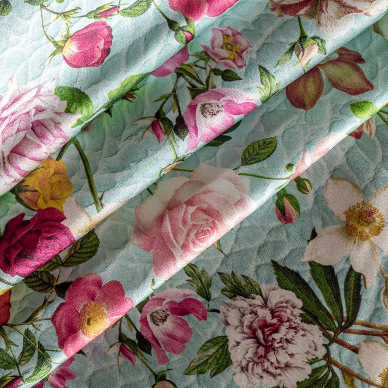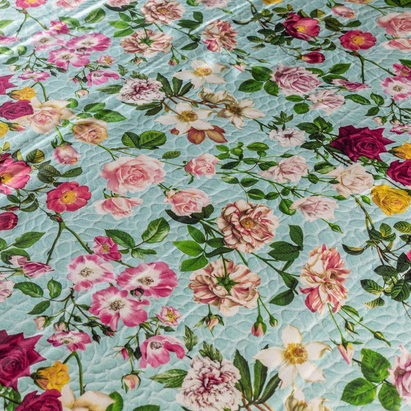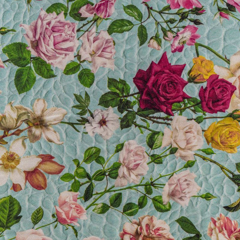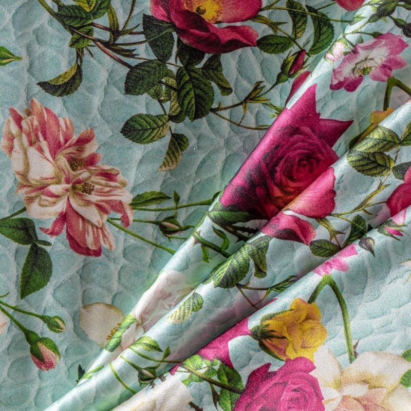 Итальянский атласный шелк с цветочным принтом на мятном фоне, имитирующем фактурную поверхность, тонкий, слегка прозрачный, отлично драпируется,  легкий и струящийся. Идеально подойдет для пошива платьев и сарафанов расклешенных моделей, с воланами, летящих юбок, топов, блузки, костюма в пижамном стиле.