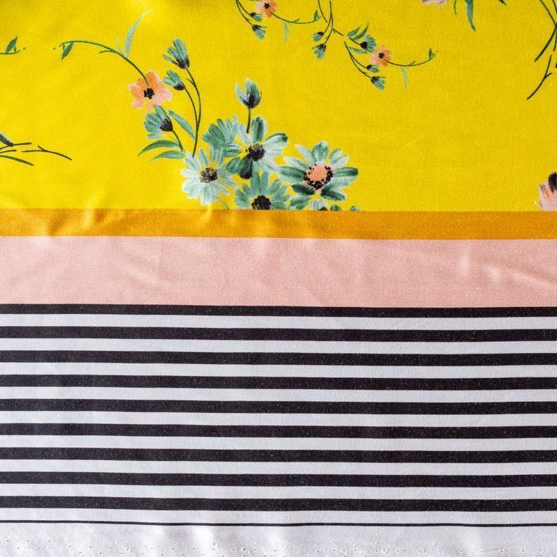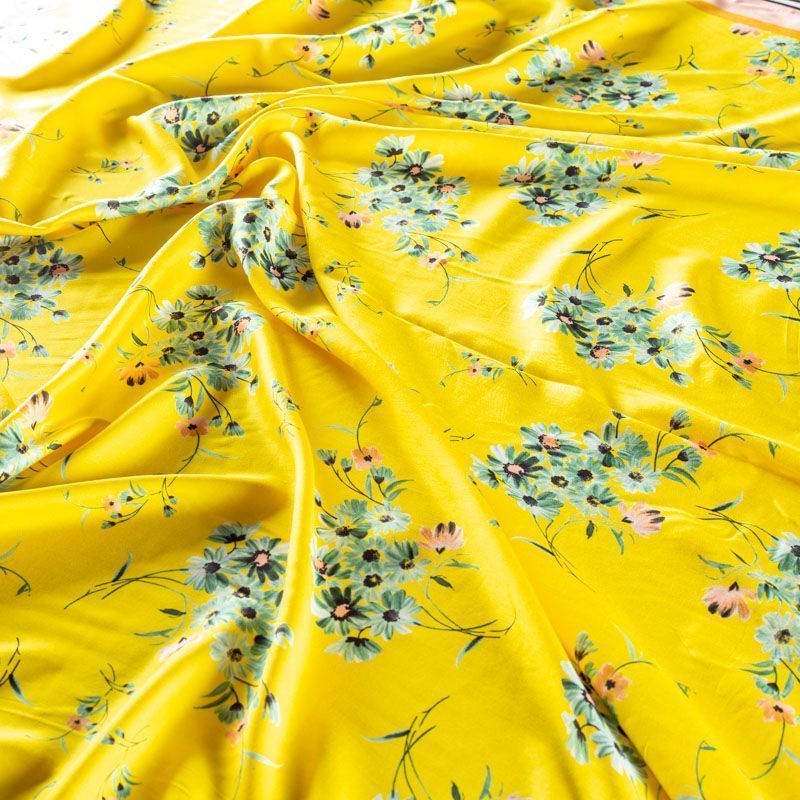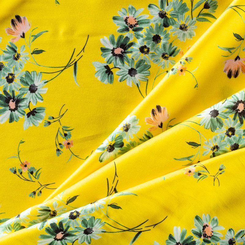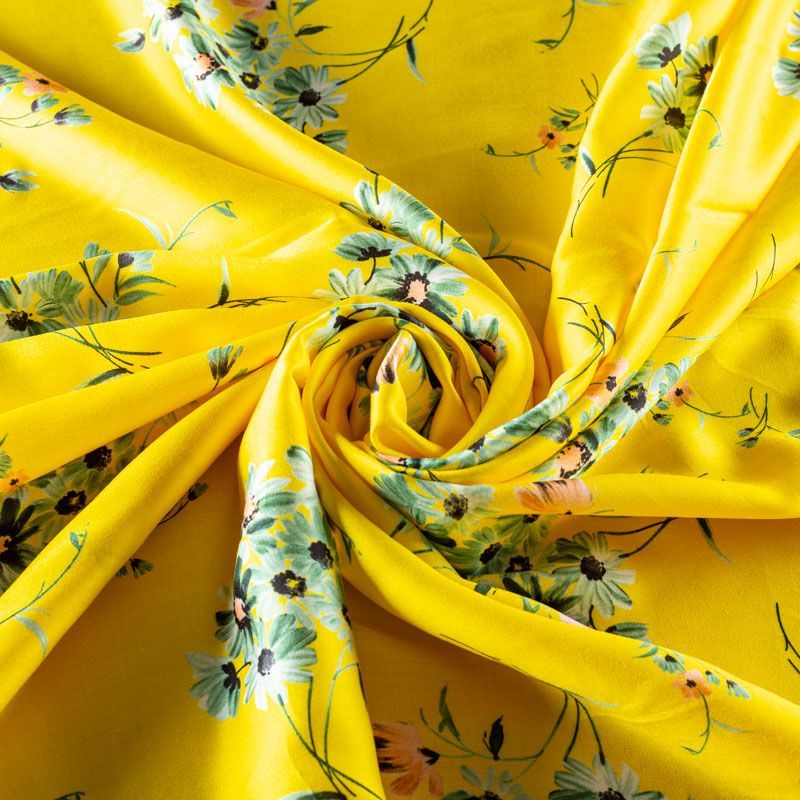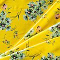 Итальянский плательно-блузочный штапель с добавлением шелка ярко-желтого оттенка с цветочным принтом и декоративным кантом вдоль кромки. Мягкий, нежный, пластичный, шелковистый на ощупь, хорошо драпируется, практичный. Особенно актуален летом, он очень легкий, обволакивающий прохладой. Идеален для пошива летней детской одежды, сарафанов, платьев, юбок, блузок, домашней одежды: халатов, ночной пижамы.