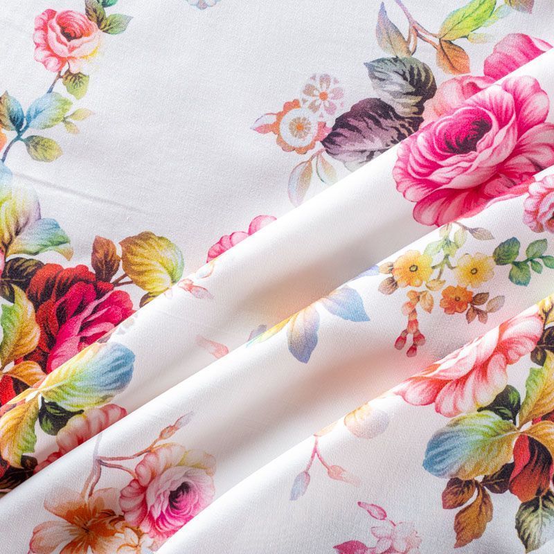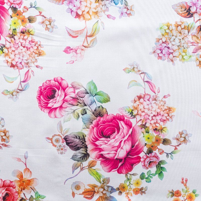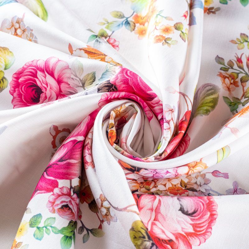 Плательно-блузочный штапель с добавлением шелка с ярким цветочным принтом. Ткань очень мягкая, нежная, пластичная, шелковистая на ощупь, хорошо драпируется, практичная. Особенно актуальна летом, шелк-штапель очень легкий, обволакивающий прохладой. Идеален для пошива летней детской одежды, сарафанов, платьев, юбок, блузок, домашней одежды: халатов, ночной пижамы.