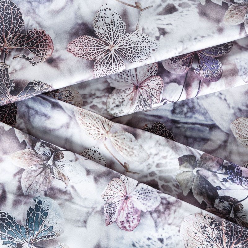 Плательно-блузочный штапель с добавлением шелка бело-лиловых оттенках с реалистичным растительным принтом. Мягкий, нежный, пластичный, шелковистый на ощупь, хорошо драпируется, практичный. Особенно актуален летом, он очень легкий, обволакивающий прохладой. Идеален для пошива летней детской одежды, сарафанов, платьев, юбок, блузок, домашней одежды: халатов, ночной пижамы.