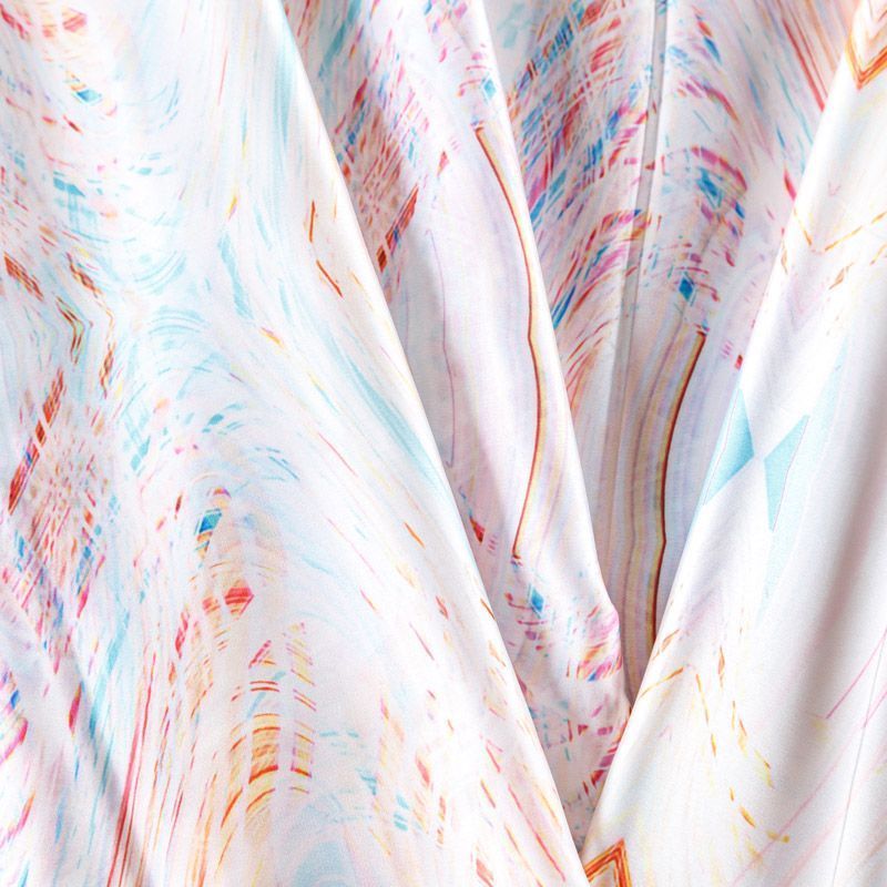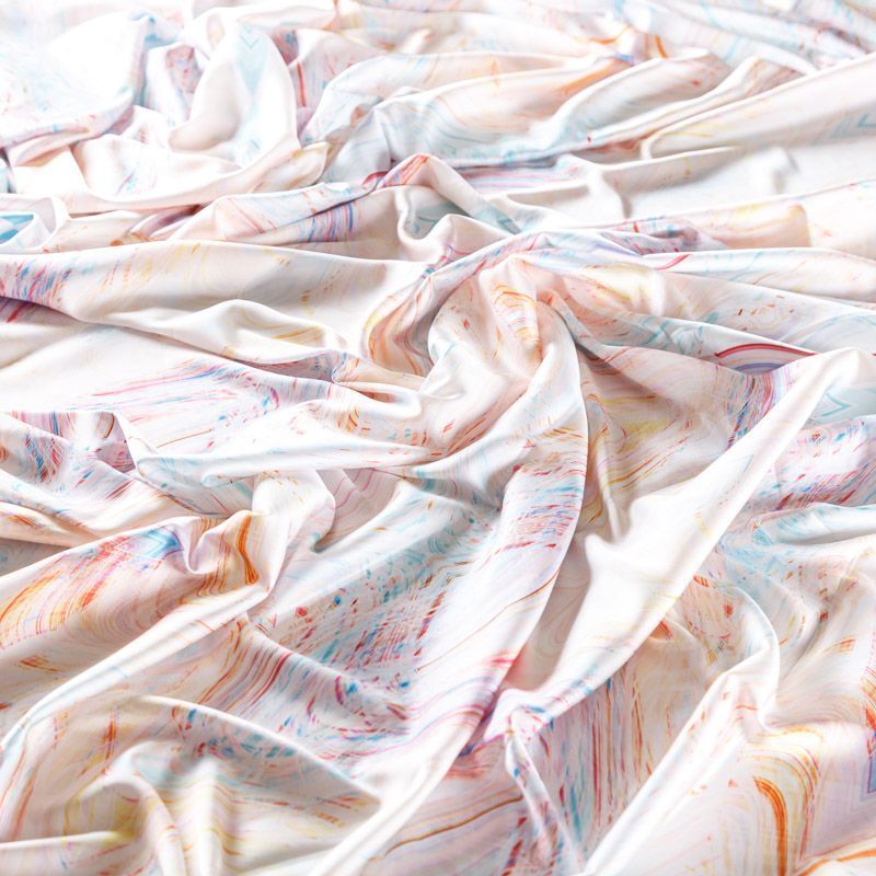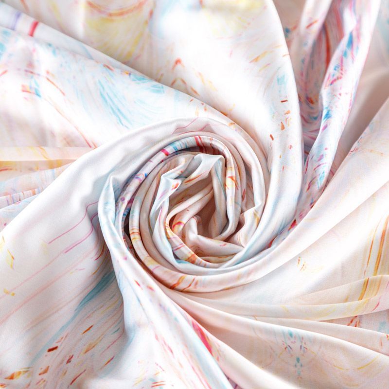 Тонкая, легкая, струящаяся ткань, не просвечивает, очень нежная и прятная к телу, обладает благородным атласным блеском, хорошо драпируется, тянется за счет эластана в составе. Идеально подойдет для пошива блузок, платьев и юбок, а также топов, платков, домашней одежды.